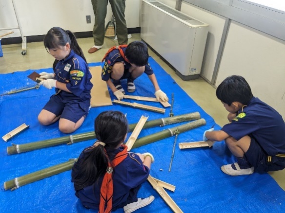 竹の長さで音の高低が変わるので、スカウトがそれぞれに長さを決めて竹を切ります。最初は悪戦苦闘ですが、だんだん慣れてきます。スカウトはなかなかの集中力です。ケガをしないか、リーダーの方が緊張します(汗)