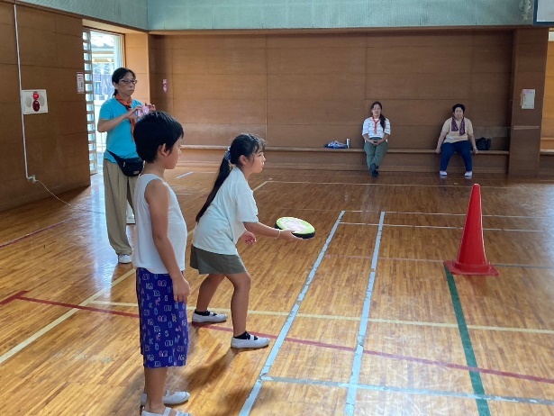 おやつを食べて元気になったら、次は体育館でドッジビー(フリスビーを使ったドッジボール)です。5団対9団の対戦。結構盛り上がります。