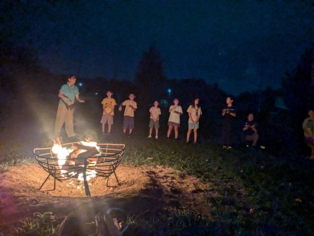 夜は涼しくなりました。厳かな雰囲気の中、毎年恒例のキャンプファイヤーです。営火長から能登地震や中東情勢を振り返り、安全に平和に暮らせていることはとてもありがたいというお話がありました。本当にそうですね。昼間ははしゃいでるスカウトもしんみり聞いています。