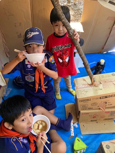 お待ちかねの芋煮です。2杯、3杯とお代わりするスカウトもいます。だしと醤油の味付けもばっちりです。一つ一つ里芋の皮をむくなど、手間暇をかけた丁寧な下ごしらえに、スカウトたちへの愛情があふれています。I団委員さん、H団委員さんを始め団委員、育成会の皆様、ありがとうございました!