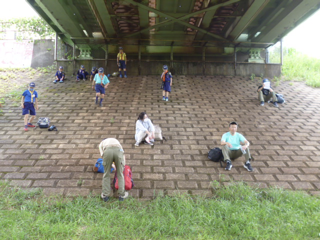 日陰になる鉄橋の下で休憩し水分補給。電車が通るたびにその大きな音に驚きながらもはしゃいでいるスカウト達。