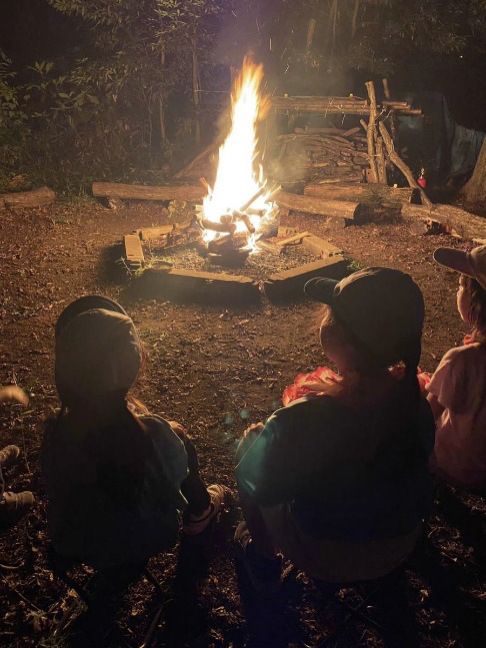キャンプファイアの火がみんなの顔を明るく照らしています。