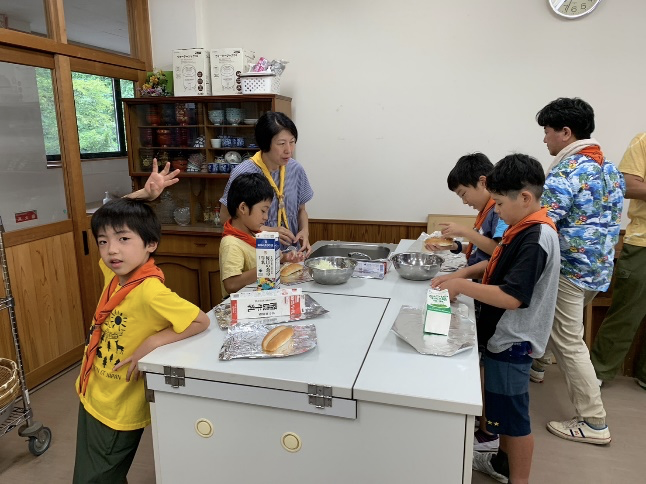 朝食はホットドック、みんなで協力して作ります。パンにソーセージとキャベツを挟んでアルミホイルに包みます。