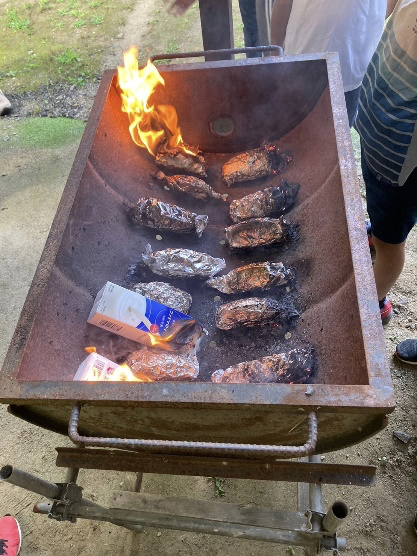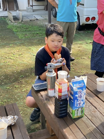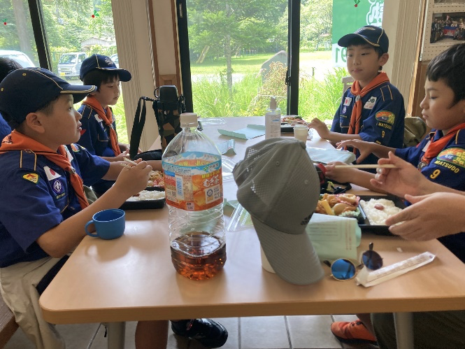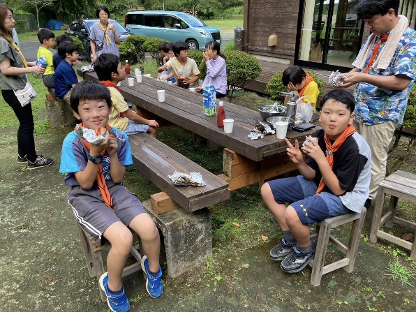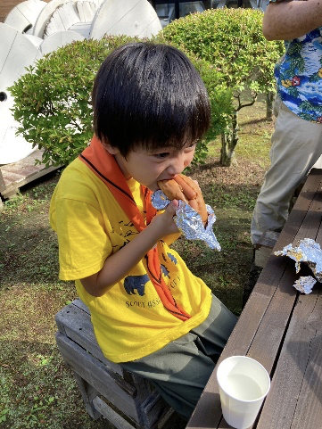 「うまい、うまい!」 11人のスカウトに残りは8本。お代わりをどう分けるかはスカウトたちが相談して決めます。