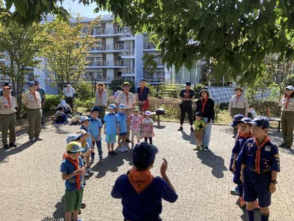 始まりのセレモニーです。カブ隊組長の指揮で元気に歌います。