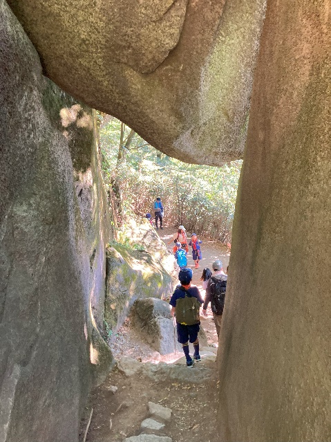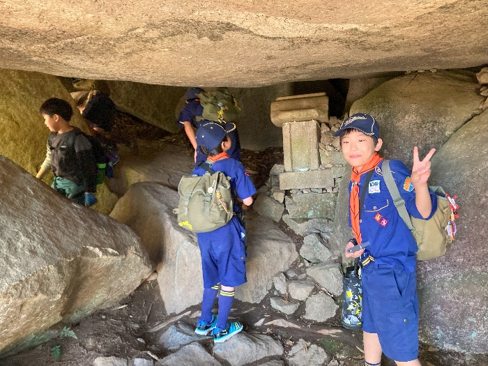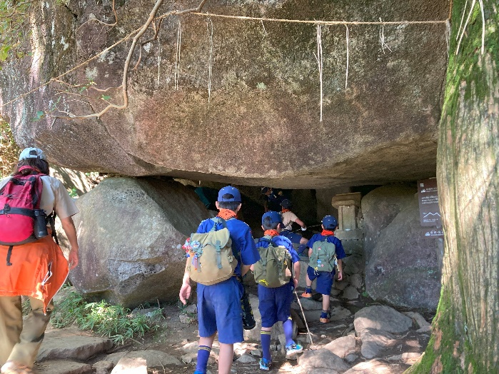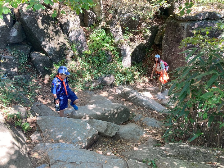 大人でも大変な岩道、急傾斜ですが、スカウトはがんばります。隊長はお疲れ気味!?