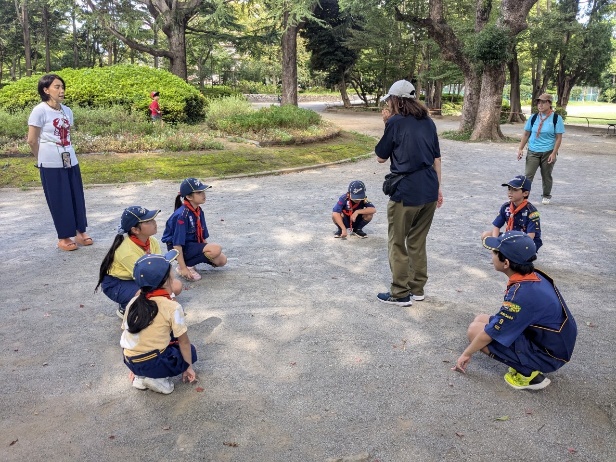 松戸中央公園に集合。朝のカブコールの後、電車とバスを乗り継いで移動します。