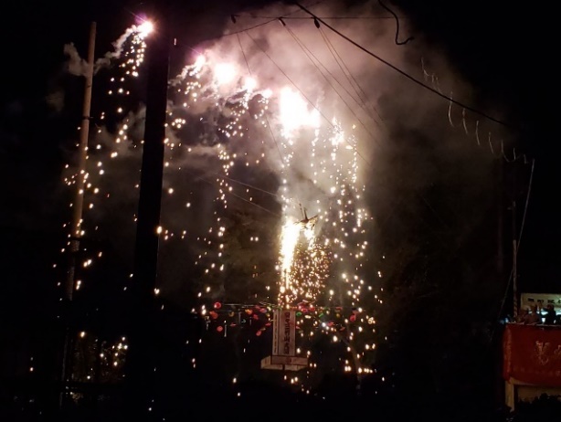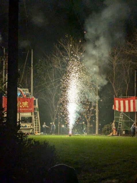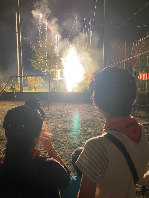 すごい仕掛け花火の数々です。いくつかの演目があり、和楽器の演奏や口上に合わせて大きなからくり人形が動き、様々な仕掛け花火がきれいに、そして大迫力であがります。鯉の滝登りの演目もありました。スカウトたちよ、竜になれ!!!